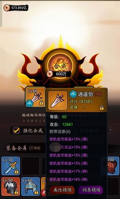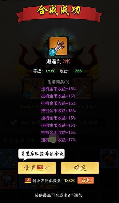 我主装备6个挂机收益词条。副装备4挂机收益词条1血量词条。最终就是10挂机收益和1血量共11词条。合成有几率出的8词条就是这11个词条中随机抽取8个。只要没抽到血量。那么就全是挂机收益了。