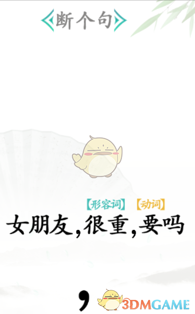 这一关的断句只需要把它变成【女朋友,很重,要吗】就可以了。