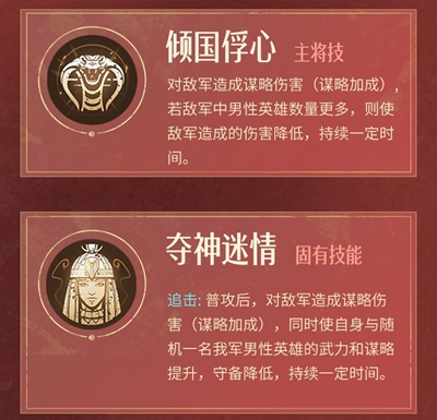 1、艳后属于打追击的辅助,兵种特性是骑兵和弓箭,战斗风格是智谋。