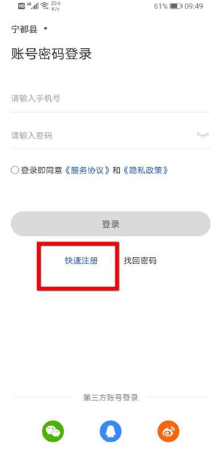 2、选择完成后,会进入账号登录界面,此时用户需要点击快速注册选项进入注册界面。