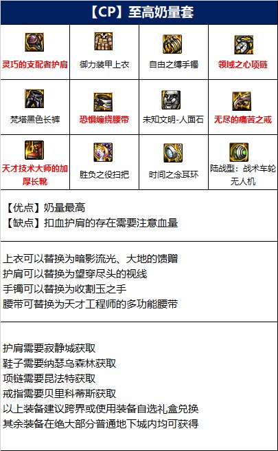 该流派是所有流派中奶量最高的一套搭配,在装备词条等级相同的情况下,没有任何流派的能量能比这个流派高,但该流派由于扣血肩的存在,使得玩家需要时常注意自身的血量。