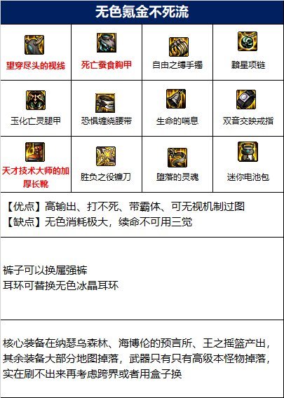 无色氪金不死流主要以死亡蚕食胸甲、天才技术大师的加厚长靴和望穿尽头的视线为核心,搭配黯星项链、自由之缚手镯、双音交映戒指、生命的踹息和迷你电池包等强力散件,使得该流派在具备较高伤害的同时,还拥有霸体和不死效果。