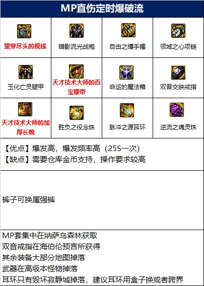 MP直伤定时爆破流主要以天才技术大师的百宝腰带、天才技术大师的加厚长靴和望穿尽头的视线为核心,搭配领域之心项链、命运的魔法箱、双音交映戒指、脉冲之源耳环和逆流之魂灵珠等强力散件,使得该流派爆发极高。