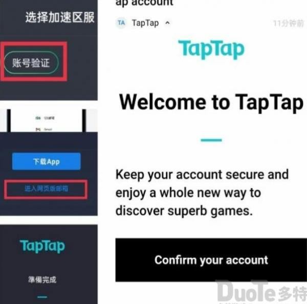 完成注册以后,我们前往到器材内取舍账号考证区服,减速以后就能够加入考证账号的过程。最后取舍网页版QQ邮箱登录,在收件箱里就能够看到tap的邮件,打开以后点击“confirm your account”确认账户,网页会提醒平安危机,取舍不断拜访。呈现 预备完成 提醒,即为考证告捷,就能够利用该账号登入游戏了。