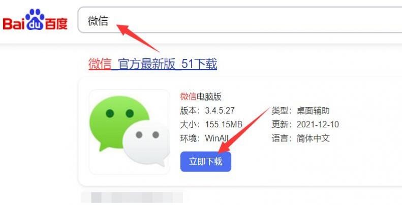打开电脑浏览器,在搜寻框输入微信,找到电脑版微信点击登时下载。