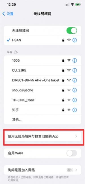 在无线局域网界面中,点击运用无线局域网与蜂窝网络的APP。
