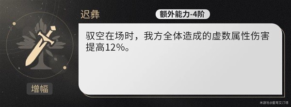 驭空的行迹里有这么一项,当驭空在场时全体获得虚数伤害加成。一眼顶真,鉴定为艾丝妲行迹复制粘贴。但驭空本身是没有其他增伤区的,用这个行迹驭空辅助虚数C的情况下就同时有了双暴加成、攻击力加成和增伤,直接梦中情辅。