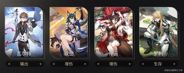 三辅一,即强力的生存位+C位+辅助+辅助/工具人。停驭组合就是不错的双辅,对于依赖终结技的角色辅助效果更佳。不过强力的生存位目前只有白露、罗刹和杰哥。