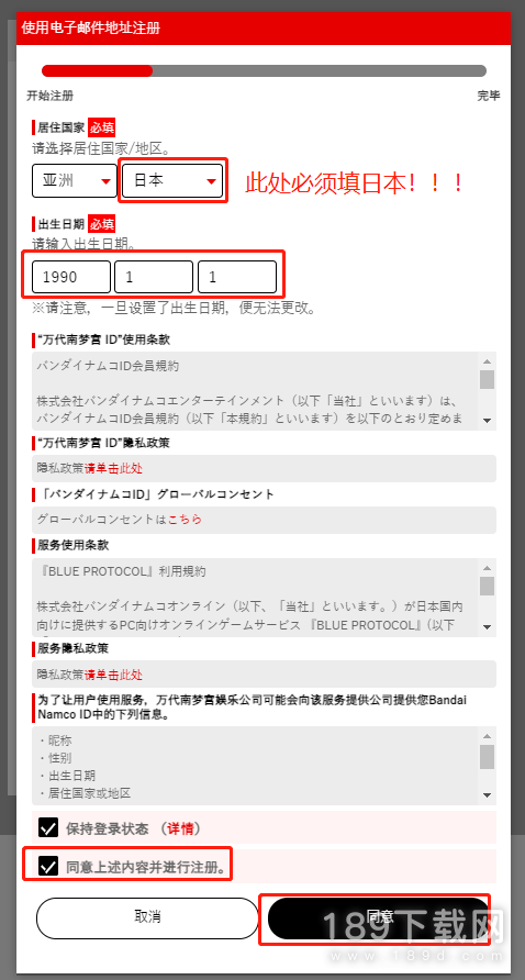 4、这里演示电子邮箱注册方法。国家/地区务必选择日本。