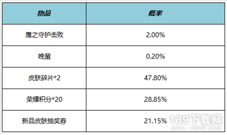 购买礼包必得红蓝对决(1日),可额外随机获得以下之一:娜可露露专属击败-鹰之守护、晚萤、荣耀积分*20、皮肤碎片*2、新品皮肤抽奖券*1。累计75次必得全部局内特效。