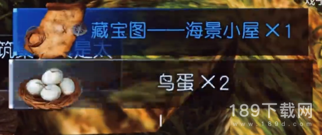 2、到达坐标位置之后,会看到一个树干,在树干的树洞里面有鸟蛋和一张藏宝图海景小屋,这样就可以获得海景小屋的藏宝图了;