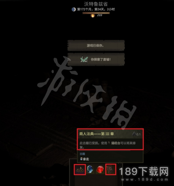 在V区古墓里可获得商人法典123章,海洋符文,繁荣符文,人群符文和可研究出紫装单手斧(奈普提斧)的先民宝藏。