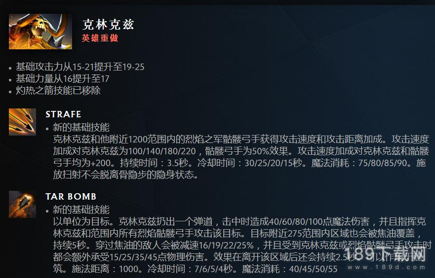 25级天赋从灼热之箭齐射改为焦油炸弹齐射(克林克兹只要攻击被焦油覆盖的英雄,他就会对攻击距离内一个随机敌人发动攻击)