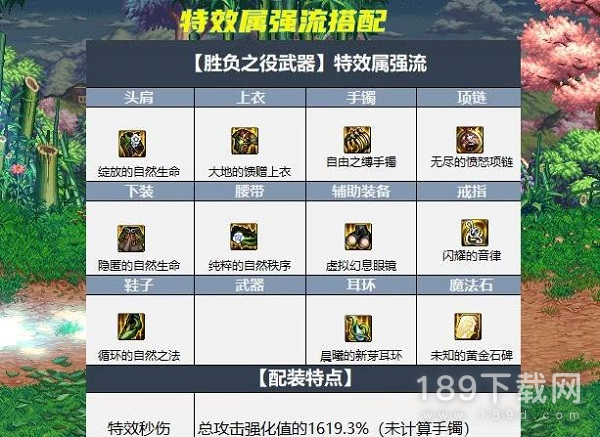 这套特效流搭配,总攻击强化数值1619.3%,未计算手镯,之所以选择“晨曦的新芽耳环”,是为了更好的达到250属强门槛,当戒指在属强达到250门槛后,可换自定义史诗,或者绽放的神秘之花;