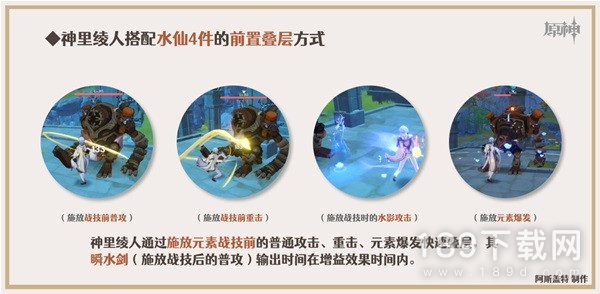 ①.神里绫人可通过启动元素战技前,打出一次“普攻+重击”的方式叠层,主要利用元素爆发的水花剑伤害将4件套效果叠满,使后续瞬水剑(普攻)获得最高层数的增益效果。