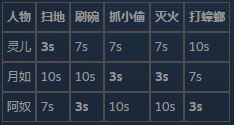 从上表可见,灵儿擅长扫地,月如擅长抓小偷和灭火,阿奴擅长刷碗和打蟑螂,尽量选择合适的人选来处理突发事件吧!