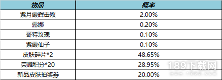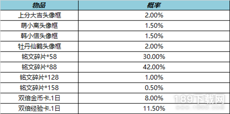 打开后可随机获得以下奖励之一:上分大吉头像框、萌小离头像框、韩小信头像框、牡丹仙鹤头像框、双倍金币卡:1日、双倍经验卡:1日、铭文碎片*158/128/88/58。