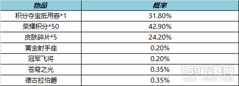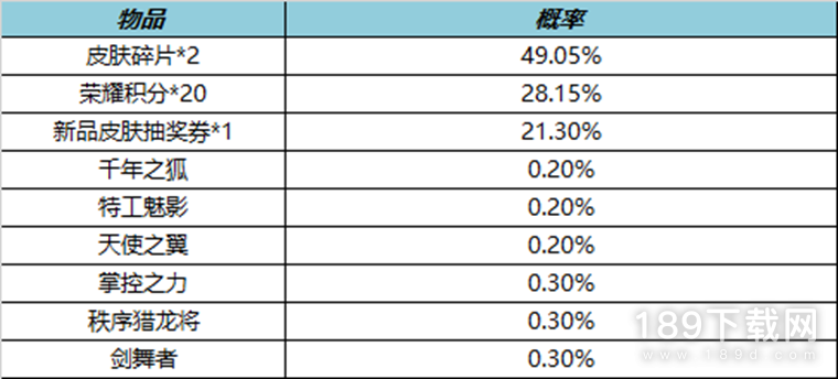 皮肤碎片&积分自选礼盒:打开礼包可任意选择以下奖励之一:荣耀积分*10或皮肤碎片*1