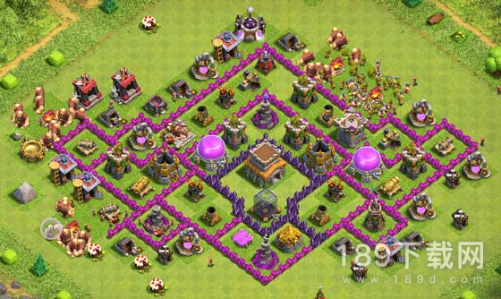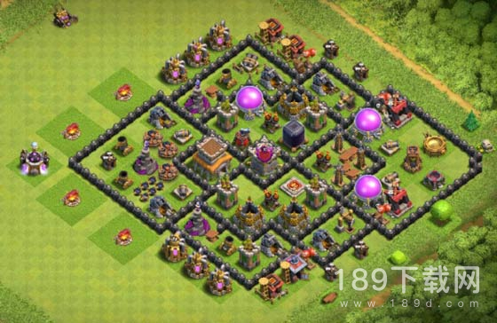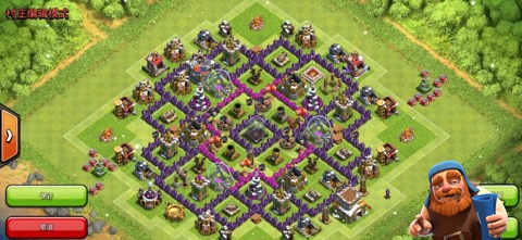 最外的箭塔和炮塔没有阻挡,狭小位置放置陷阱,法师塔、迫击炮活力均衡,防空塔三角之势、资源库分离。黑水与部落城堡在中间,防止援兵被偷袭。