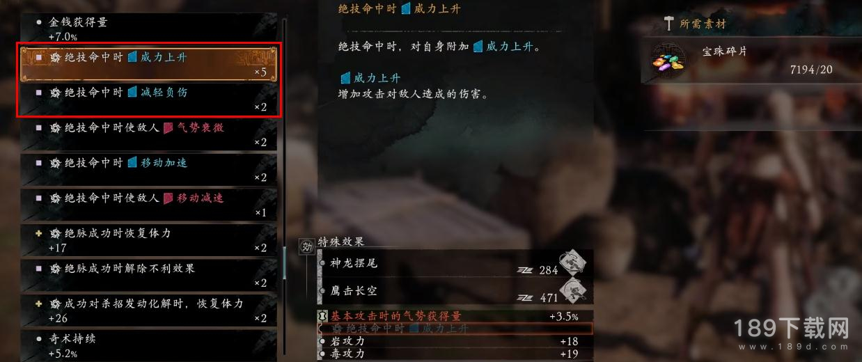 绝技命中时威力上升/减轻负伤/敌人负伤加重,最优质武器词条。玩家在连招时可以穿插一下武器绝技,只要释放成功就能触发词条加攻击/减伤/敌人减防。
