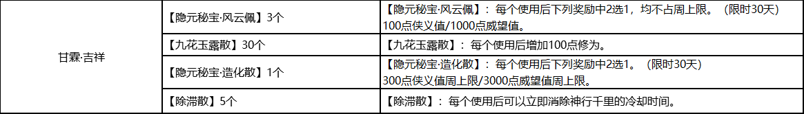 4、领取方式:满足条件的侠士上线后前往信使处可领取【甘霖·吉祥】道具*1颗,使用【甘霖·吉祥】后将得到一个持续两周的增益状态【甘霖·吉祥】。侠士携带此增益状态完成角色等级提升1次、“赏金”系列秘境日常、阵营日常(黑龙聚义)、茶馆任务(久经风霜百炼钢)系列任务中的任意一项后,【甘霖·吉祥】增益状态消失,此时侠士可前往游戏内的任意信使处即可领取补偿物品。
