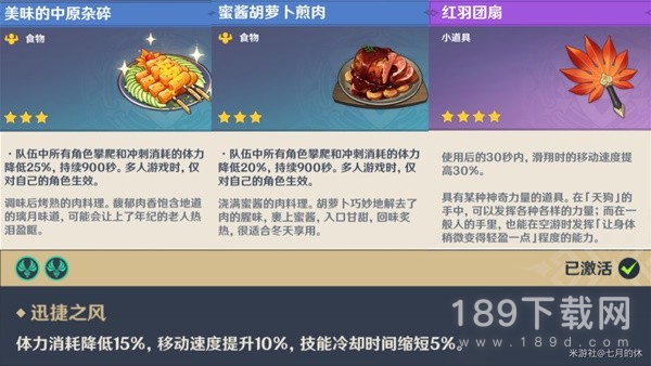 推荐携带双风+跑图角色,也可以吃降低体力消耗的料理,及携带红扇子