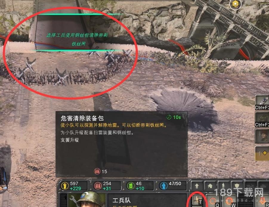 工兵可装备火焰喷射器或者危害清除装备包,装备危害清除装备包后就可以用钢丝钳破坏铁丝网了。