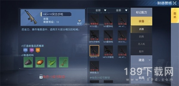 HK416是一款10级后可以制作的突击步枪,其详细的制作要求如下:
