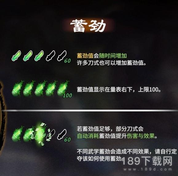 玩家使用刀类武器时蓄劲值会随时间增加,许多刀式也可以增加蓄劲值。若蓄劲值足够,部分刀式会自动消耗蓄劲值提升伤害与效果。