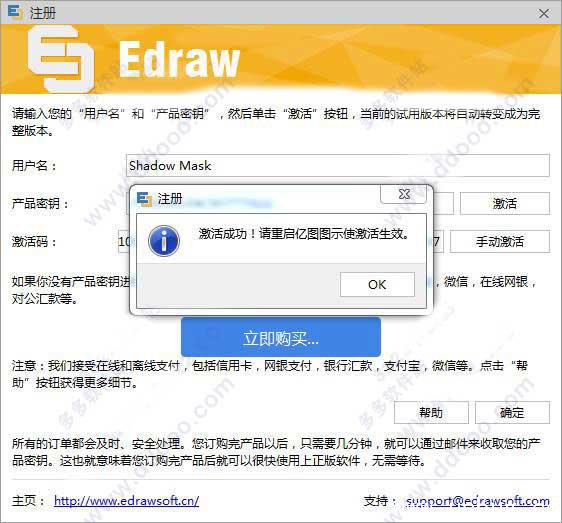 7、断开网络(你可以拨了网线或禁用网络),启动亿图图示9.2,点菜单“帮助->激活”,依次粘贴用户名和注册码;