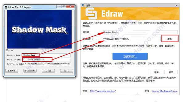 6、这里打开软件包中亿图图示9.2注册机,点击界面“2.Generate”按钮,这时候会算出适用您计算机的用户名|注册码|激活码。(注:请千万不要点击“1.Patch”按钮)